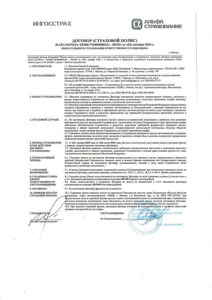 Профессиональная ответственность Оценщика застрахована на сумму 100 млн. рублей.